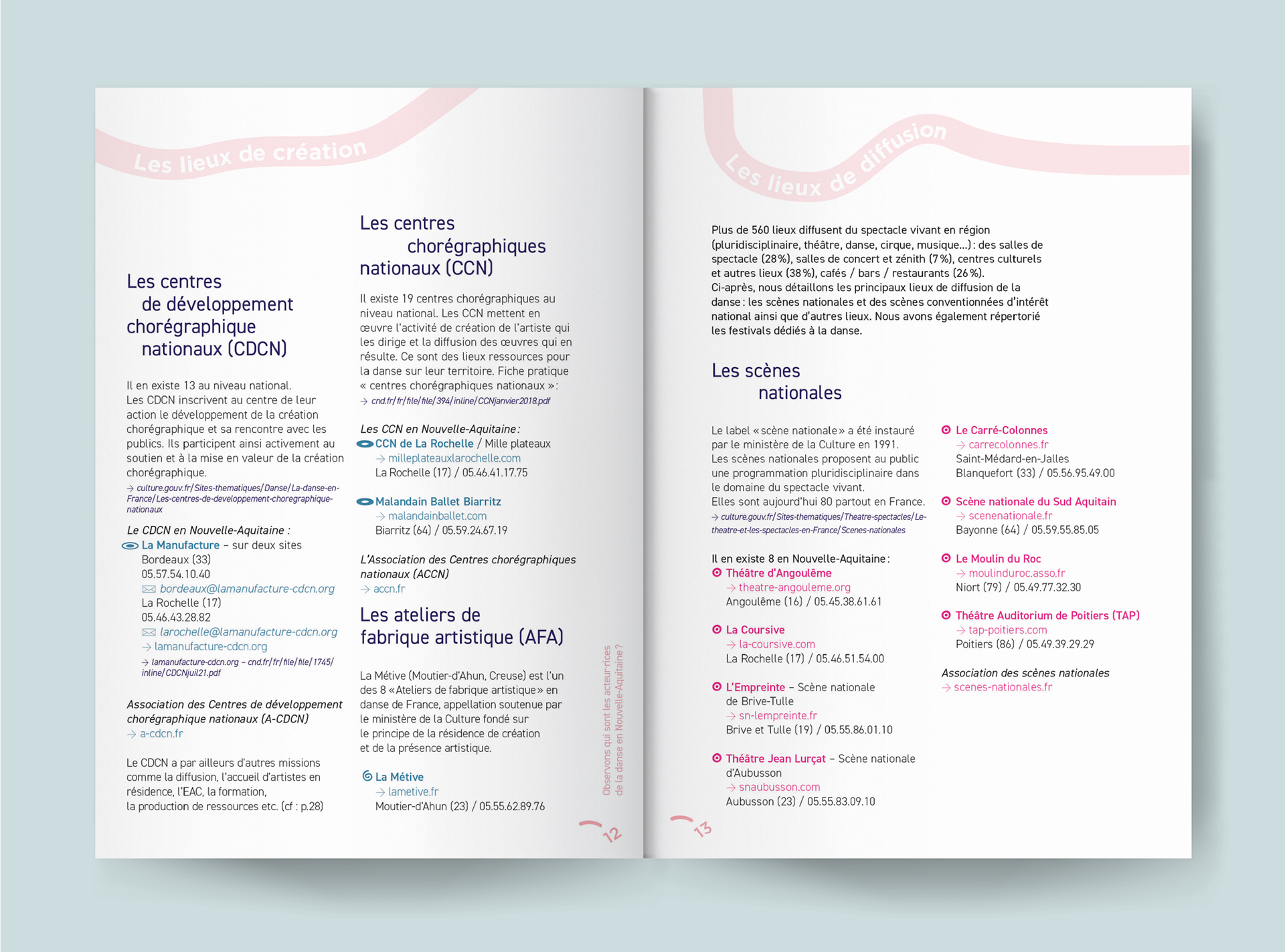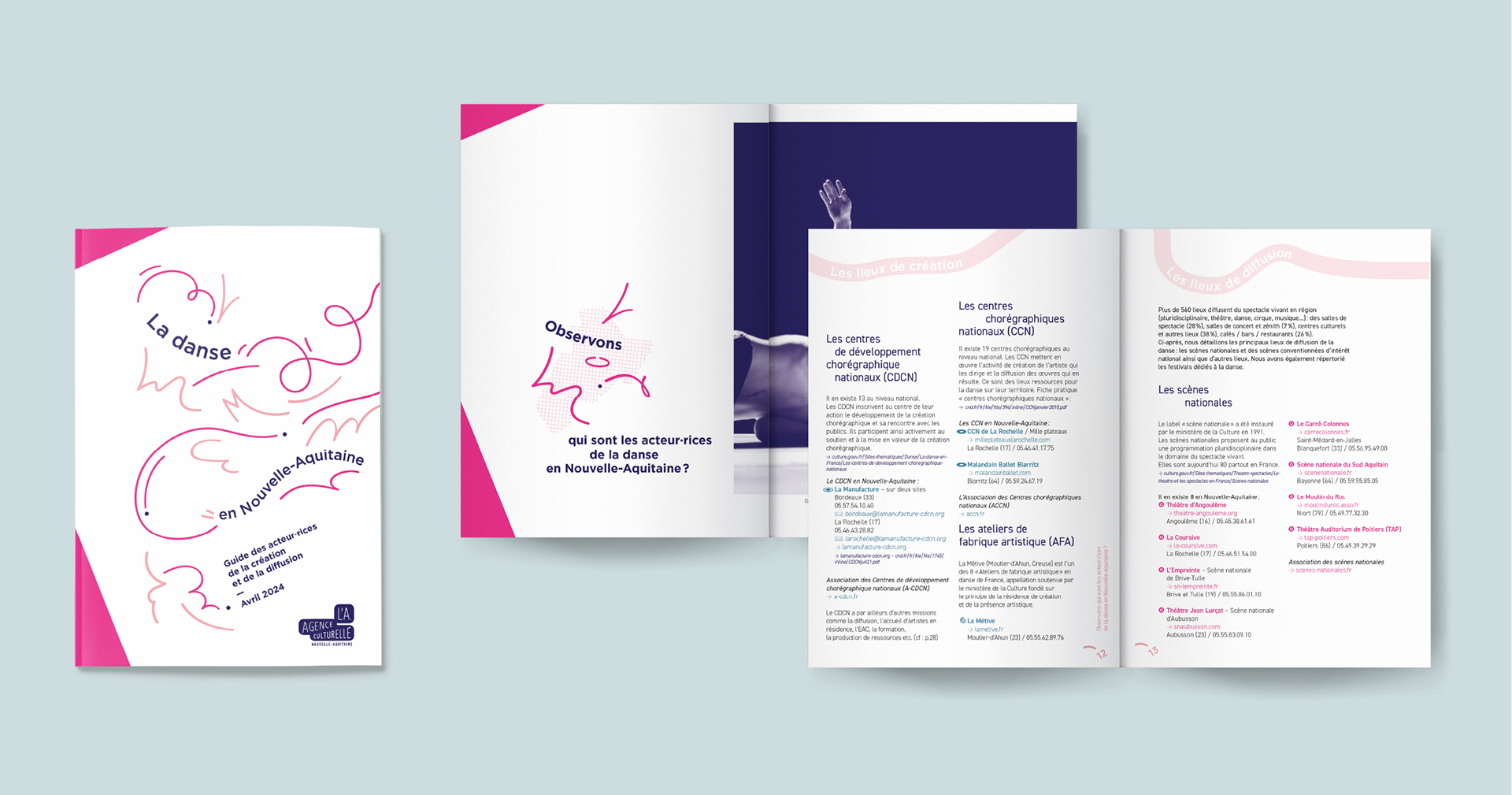 Ce guide a été conçu pour les compagnies, collectifs et artistes de la danse, acteur·rices de la diffusion et structures ressources. Inspirée par le mouvement en fil conducteur, j’ai réalisé la conception graphique et la mise en page du guide.