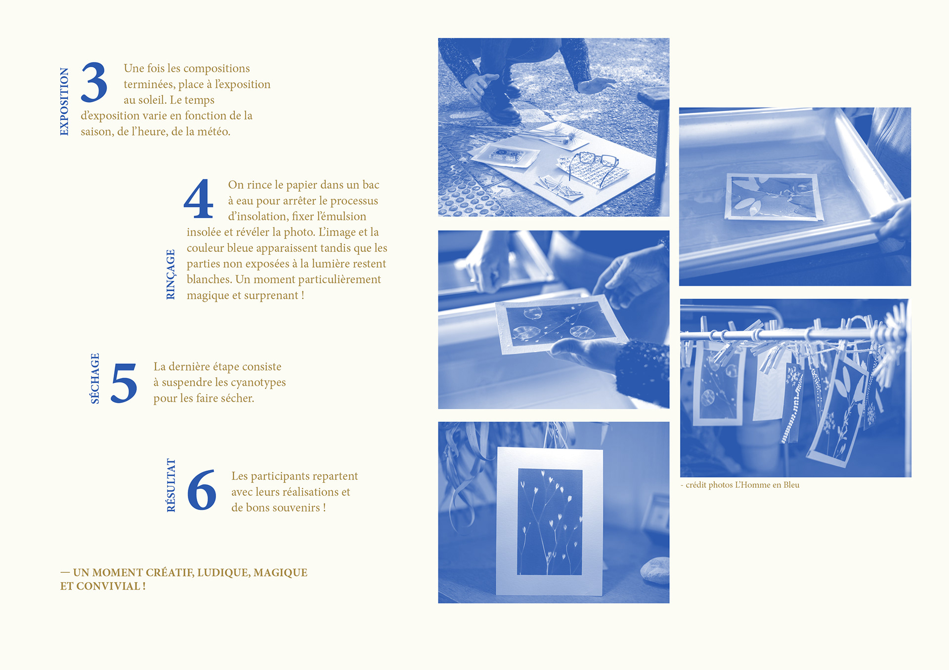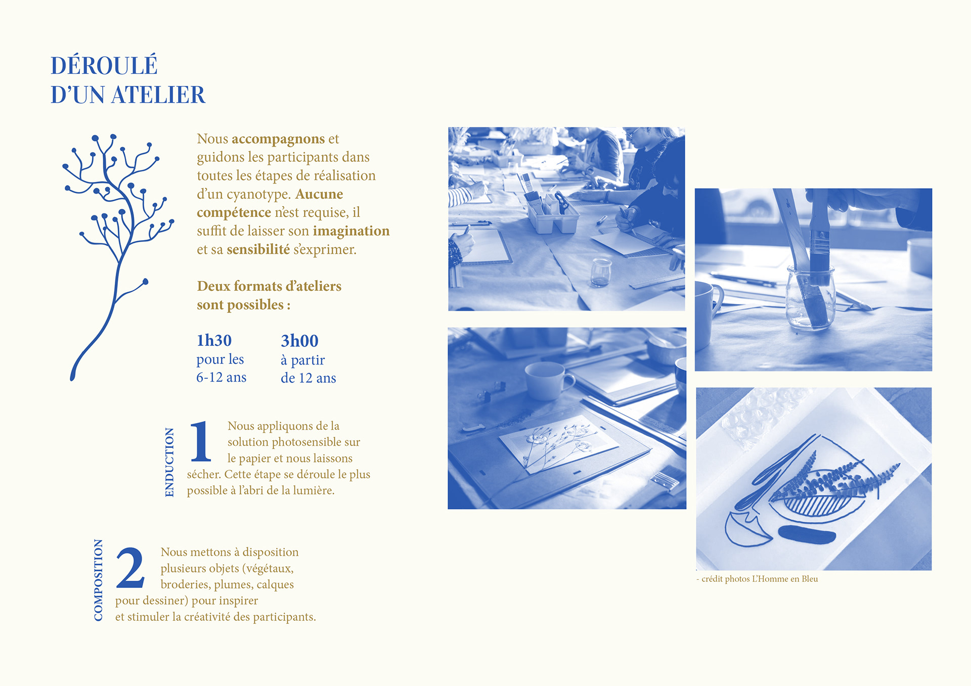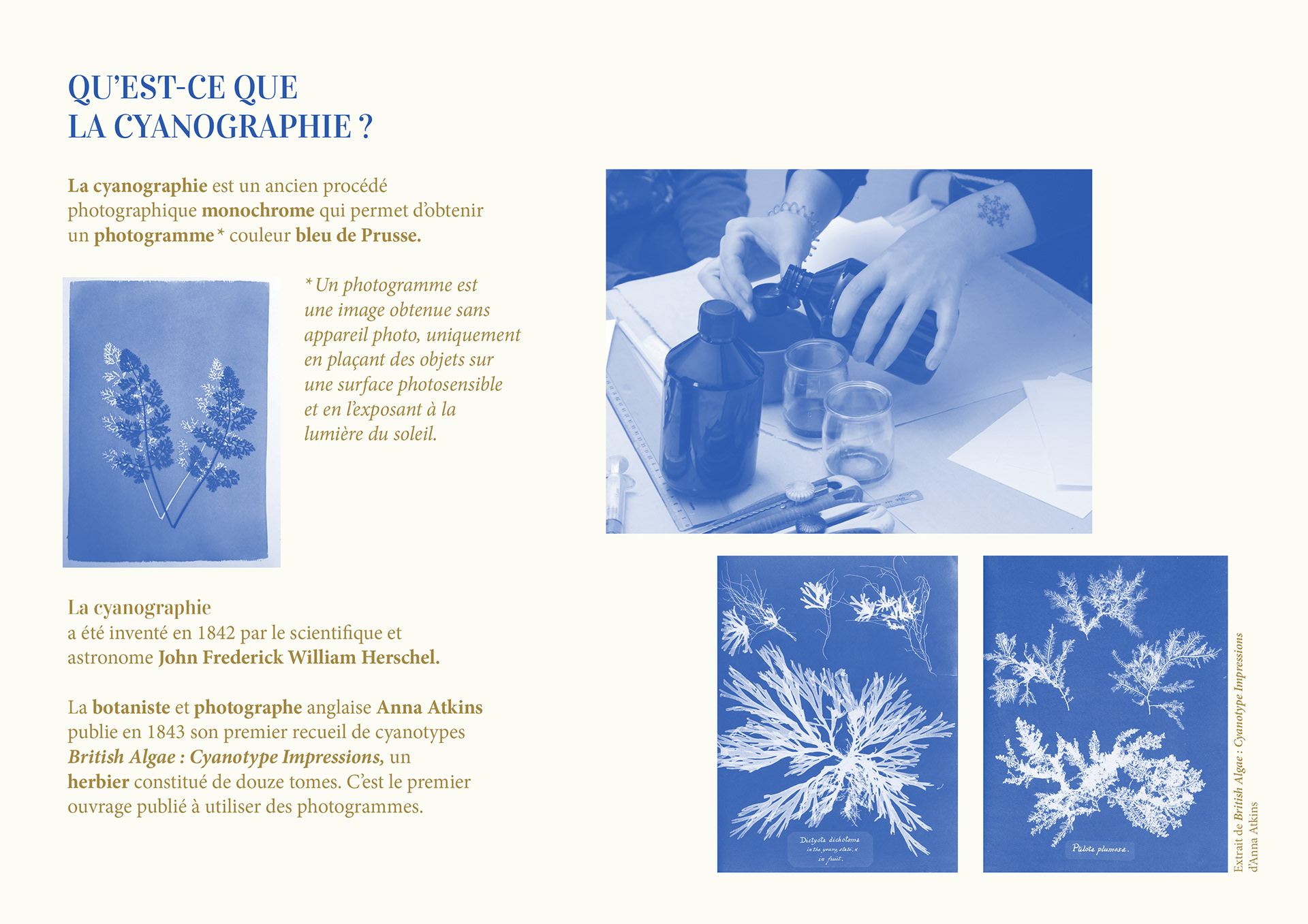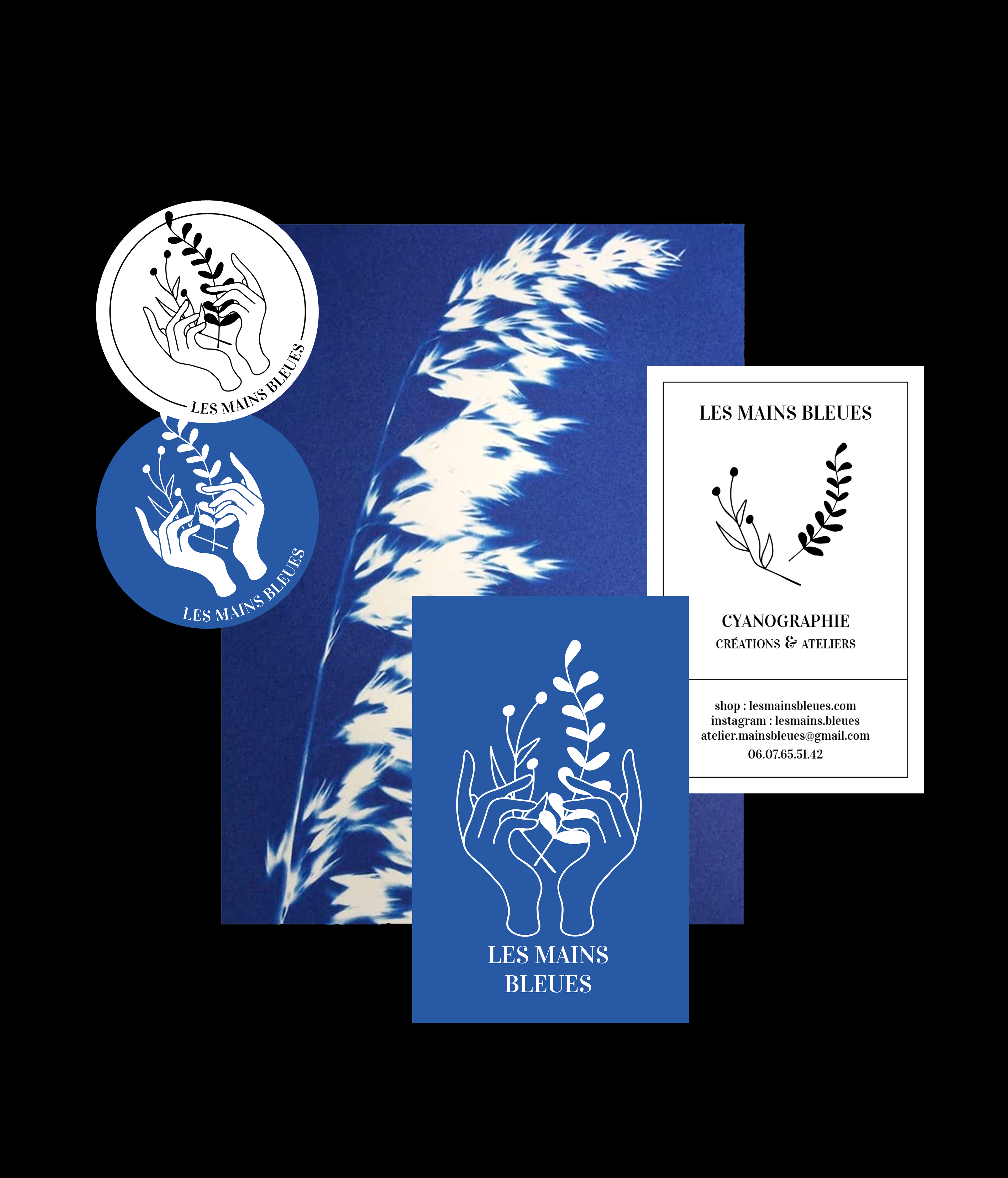 Les Mains Bleues est un collectif d’impression photo en cyanotype. Il s’agit d’un ancien procédé photographique monochrome qui permet d’obtenir un photogramme couleur bleu de Prusse.